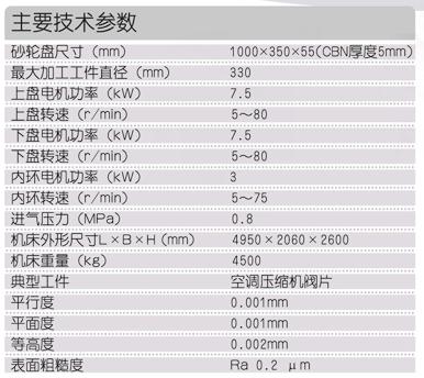 本機床采用立式布局,主機床身采用鑄鐵構件,減少加工時振動,確保加工精度。上、下研磨盤及內環均采用交流變頻無級調速,保證了研磨各種材料和各種形狀工件的工藝轉速。氣動控制實現上研磨盤擺入、擺出和上升、下降動作,便于操作。采用預壓、主壓、后壓三階段壓力控制,壓力值可任意調整并可自動轉換。