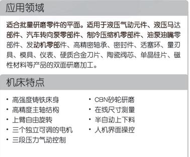 本機床為自動、高效率機床,適用于批量研磨零件。主要用于研磨零件的平面,適用于鋼、鑄鐵、銅、硬質合金、陶瓷、單晶硅等的加工??梢詮V泛用于液壓氣動元件、液壓馬達部件、汽車燃油泵部件、制冷壓縮機零部件、油泵油嘴零部件、發動機零部件、高精密軸承滾柱及套圈、密封件、活塞環、量刃具、模具、儀表、硬質合金刀片、陶瓷閥芯、磁性材料等產品的雙面研磨加工。